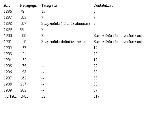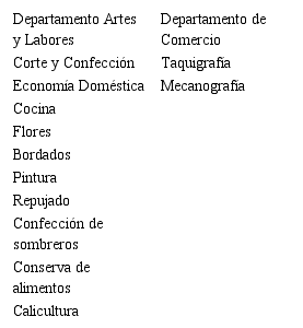 Las materias que ofrecía el currículo se muestran en la tabla 3, donde se ofertaban dos departamentos, el de Artes y Labores con materias de corte doméstico y el de Comercio con dos asignaturas: taquigrafía y mecanografía.