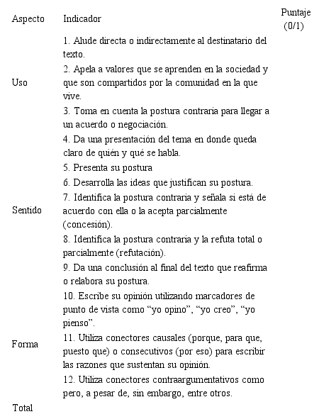 Para evaluar los textos se empleó el “Instrumento para evaluar artículos de opinión” de Bautista, Espinoza y Leal (en prensa). Este se elaboró en el marco del interaccionismo sociodiscursivo y a partir de un proceso de modelización como herramienta metodológica para analizar los géneros textuales. El instrumento contiene 12 indicadores que se agrupan en los aspectos de uso, sentido y forma que componen el género textual. Cada indicador vale un punto. En total se pueden alcanzar hasta 12 puntos (véase anexo).