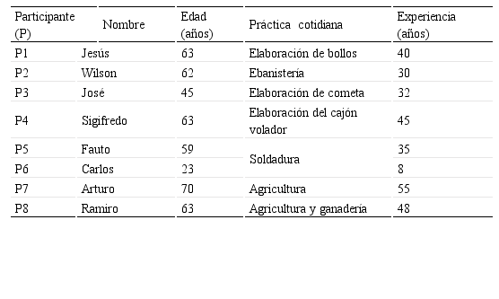 Los participantes (P) del estudio fueron ocho artesanos voluntarios que desempeñan sus prácticas cotidianas en el municipio de Baranoa[3] (tabla 1). En el análisis y resultados, el entrevistador (autor de la investigación) se denominó E.