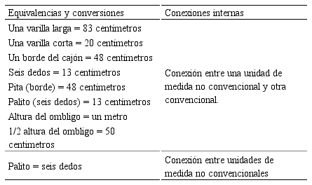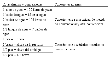 En las fases de elaboración del bollo de yuca se han evidenciado unidades de medidas convencionales (libra, centímetro, metro, litro) y no convencionales (bulto, saco, lao, carga, tercio, jeme, braza, altura de la persona, altura del ombligo). Estas unidades de medida conforman el sistema de medida usado por P1 en la elaboración del bollo de yuca. Además se identificaron equivalencias, las cuales llevaron a establecer conexiones internas entre unidades de medidas (tabla 2). En este sentido, las conexiones internas son las relaciones que hace un sujeto entre unidades de medidas (convencional o no convencional) de un mismo sistema de medida usado en una práctica cotidiana, considerando equivalencias y conversiones.