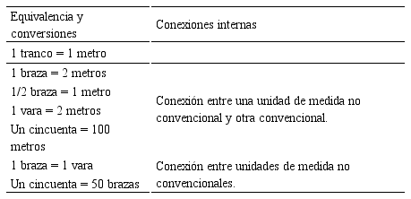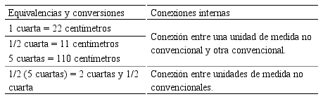 En la tabla 5 se presentan las conexiones internas que se promueven en las equivalencias y conversiones entre unidades de medida identificadas en la elaboración del cajón.