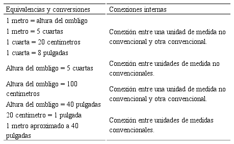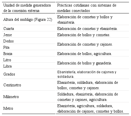 Cabe destacar que la “altura del ombligo” es usada para medir longitudes, por ejemplo, en la ebanistería la emplean para instalar cerraduras; en la elaboración de bollos la usan para medir la pita, y en la elaboración de cajones para medir las varillas. Otras investigaciones usaron la “altura del ombligo” para mediciones en la albañilería (Rey y Aroca, 2011). En la tabla 7 se sintetizan las conexiones externas evidenciadas en los sistemas de medidas de las diferentes prácticas cotidianas.