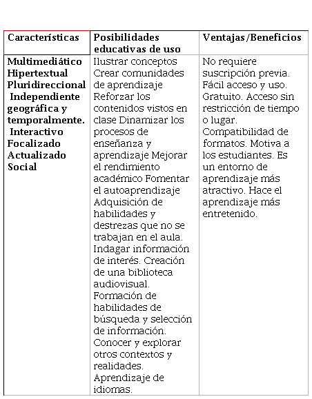 En el contexto educativo se ha estudiado la implementación de esta plataforma en los procesos de enseñanza y aprendizaje, demostrando que mejora los resultados académicos de los estudiantes debido a sus características, posibilidades de uso, así como las ventajas y beneficios que ofrece estudiantes y docentes, mismos que se presentan en la tabla 1, la cual se deriva de un análisis minucioso de diversas investigaciones (Ramírez-Ochoa, 2016; Snelson, 2011; Rodríguez y Fernández, 2017; Díaz, Lira, Olguín y Arau, 2018; Barajas, Sifuentes y Ramos, 2018; González, 2018; Abdulrahman, 2016; Watkins y Wilkins, 2011; Ruay y Campos, 2019) y permite observar lo que hace tan atractivo a YouTube para la educación.