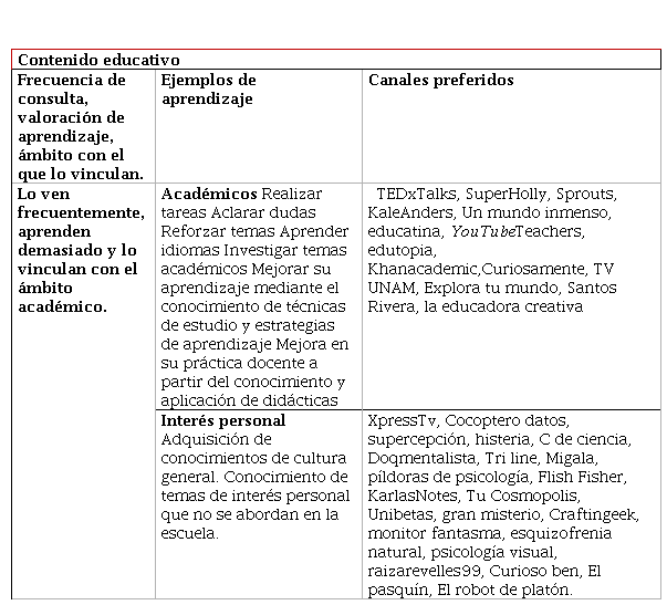 Con referencia a los canales preferidos de consulta se recuperaron 145 diferentes, los cuales se concentran principalmente en el área de “otros” –que corresponde a contenido de entretenimiento a través de videoblogs– y de educación, con 28% en ambos casos, seguidos por aquellos de belleza y estilo de vida con 16%. Es importante señalar que en la tabla 2 únicamente se presentan aquellos que se repitieron más de una vez y que resultan representativos del tipo de contenido que se encuentra en la categoría.