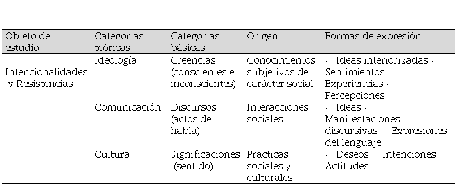 La séptima premisa indica que es necesario conceptualizar, detectar el origen y concretar las formas de expresión que permiten aproximarse a las creencias (conscientes e inconscientes), discursos (actos del habla) y significaciones (sentido) de estudiantes y docentes en torno a la enseñanza y aprendizaje del inglés, a fin de visibilizar sus intencionalidades y resistencias (ver tabla 1). Las creencias son entendidas como conocimientos subjetivos generados por cada persona; los cuales no se fundamentan sobre la racionalidad sino más bien sobre los sentimientos, las experiencias y la ausencia de conocimientos específicos del tema con el que se relacionan (Moreno y Azcárate, 2003).