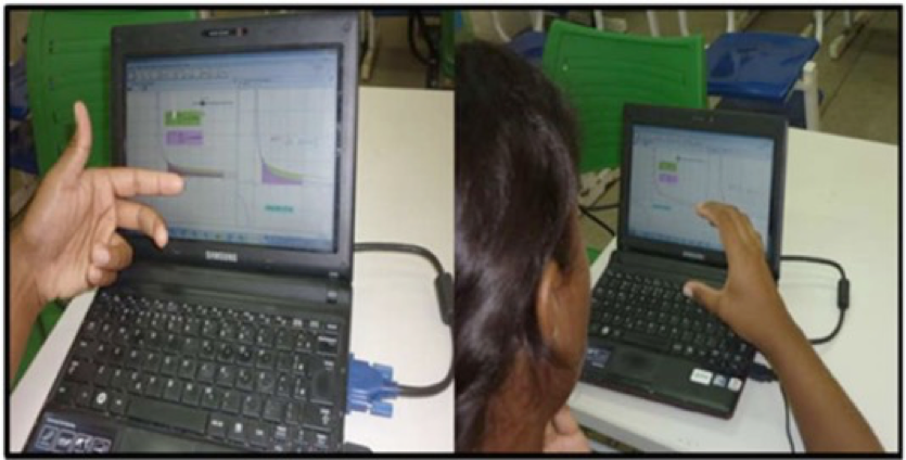 Aqui, mesmo de modo en passant, assinalamos a possibilidade de contribuição de vertentes de investigação, tais como a Ergonomia, que proporciona uma perspectiva sistemática dos fenômenos envolvendo interações homem-máquina e homem-computador. No caso particular do ensino de Matemática, exemplificamos nas figuras abaixo, as interações e a manifestação gestual que age como um amparo aos princípios de comunicação e transmissão de ideais matematicas, diante de situações de aprendizagem propostas pelo professor.