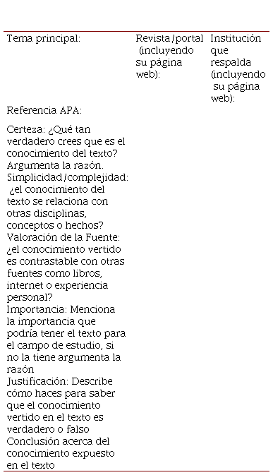 Se compartió en la plataforma LMS Moodle el “Guion para el análisis de textos desde las creencias epistemológicas”, el cual contaba con dos secciones, en una se debían llenar los espacios con la información general del texto a revisar y en la segunda se debía responder a preguntas abiertas sobre cada dimensión del modelo de creencias epistemológicas y cerrar con una conclusión sobre el texto. Se decidió añadir un apartado de “importancia” para verificar la argumentación de los estudiantes sobre la validez de los artículos para el campo de estudio, por lo que se tuvo un total de seis apartados. El instrumento se muestra en la tabla 1.