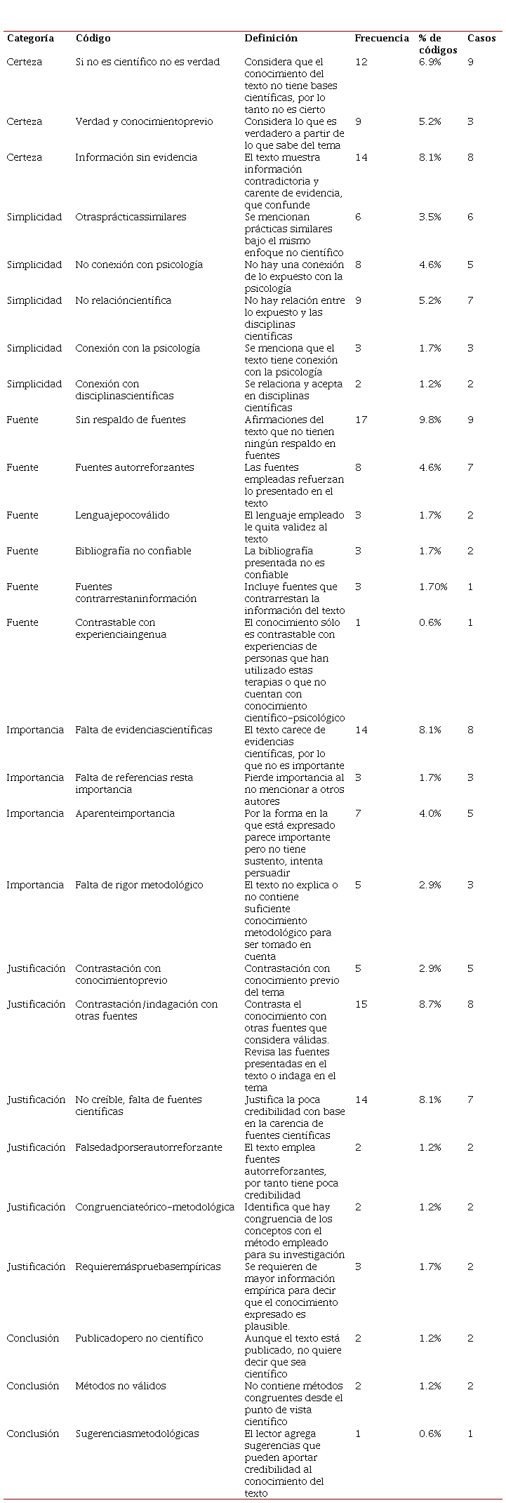 Es importante llamar la atención hacia aquellos códigos con menos frecuencia, pues son ejemplos de argumentaciones poco comunes; en ellos se encuentran principalmente dos: Contrastable con experiencia ingenua dentro de la categoría de Fuente del conocimiento, que hace referencia a que el conocimiento solo puede discutirse si se posiciona desde el mismo tipo de área pseudocientífica, la cual ven los estudiantes como ajena, distante de la psicología como ciencia; y de manera similar con el código Sugerencias metodológicas dentro del apartado de Conclusiones, en donde los estudiantes hacen referencia a procedimientos alternativos que pueden seguirse empleando métodos basados en evidencia para abordar los problemas planteados. En estos dos casos se puede afirmar que son códigos con un alto grado de sofisticación, puesto que son reflexiones más allá de solo descartar la información, dado que se ofrecen ejemplos de formas de proceder desde la psicología científica que los estudiantes han aprendido a partir de su trayectoria escolar. Esta diferencia es descrita también por Bontempo y Flores (2016), que señalan que los estudiantes pasan de posiciones ingenuas en las cuales creen que la realidad puede ser conocida como tal (de primera mano) hacia posiciones sofisticadas en las que se reconoce la necesidad de relativizar el conocimiento con evidencias vinculadas a un contexto, basando su seguridad en conocimientos que perciben en sí mismos.