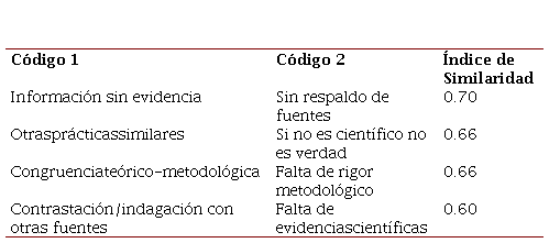 Puede observarse que fueron cuatro los pares de códigos con un índice de Jaccard mayor a 0.60, siendo el par Información sin evidencia (categoría: Certeza) y Sin respaldo de fuentes (categoría: Fuente) el que alcanzó un índice de Jaccard de 0.70. El resto de los pares, si bien mostraron índices positivos, fueron menores a 0.69.