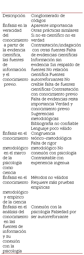 El cuarto conglomerado, denominado “Énfasis en el análisis del conocimiento en las fuentes de información y su conexión con la psicología”, agrupó dos códigos que hacían hincapié en las fuentes de información empleadas en los textos y los textos de psicología comúnmente revisados, por lo que se mencionaron dudas sobre si estaba o no relacionado con las bases teóricas del ámbito psicológico.