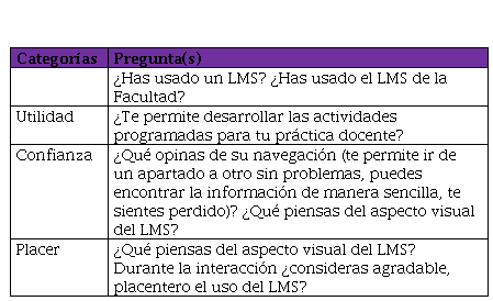 Las primeras preguntas tenían como objetivo conocer qué LMS han utilizado, y más específicamente el LMS de la Facultad de Ciencias –Moodle–. La pregunta “¿Te permite desarrollar las actividades programadas para tu práctica docente?” tenía como objetivo conocer la utilidad del LMS, en concordancia con el apartado descrito anteriormente. La pregunta “¿Qué opinas de su navegación (te permite ir de un apartado a otro sin problemas, puedes encontrar la información de manera sencilla, te sientes perdido)?” está vinculada con la confianza que puede sentir el usuario al utilizar el LMS, como lo exponen Aguirre et al. (2017). Con la siguiente pregunta, “¿Qué piensas del aspecto visual del LMS?”, se deseaba obtener información de lo agradable o no que les parece el diseño, y la pregunta “¿Consideras agradable, placentero el uso del LMS?” se hizo con la intención de obtener información respecto al apartado del placer. En la tabla 1 se presentan las preguntas y su relación con las categorías propuestas, lo que Cisterna (2005) menciona como estamentos.