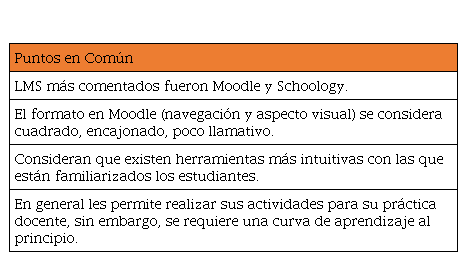 De manera general se obtuvo que al aspecto visual de Moodle se le considera como un formato muy encajonado, rígido, muy simple; si bien permite realizar las actividades, no es atractivo. Un docente comentó que la interacción con Moodle no es “ni agradable ni placentera, es un requisito”. Un docente respecto a Schoology considera que requiere una nueva configuración que lo hiciese más de sentido común, que sea más intuitivo, lo ve muy cuadrado, aunque para este mismo LMS otra docente considera que en el aspecto visual han dado “pasos agigantados” para bien, a grado tal que Schoology tuvo en el 2018 un rediseño.