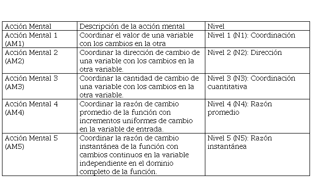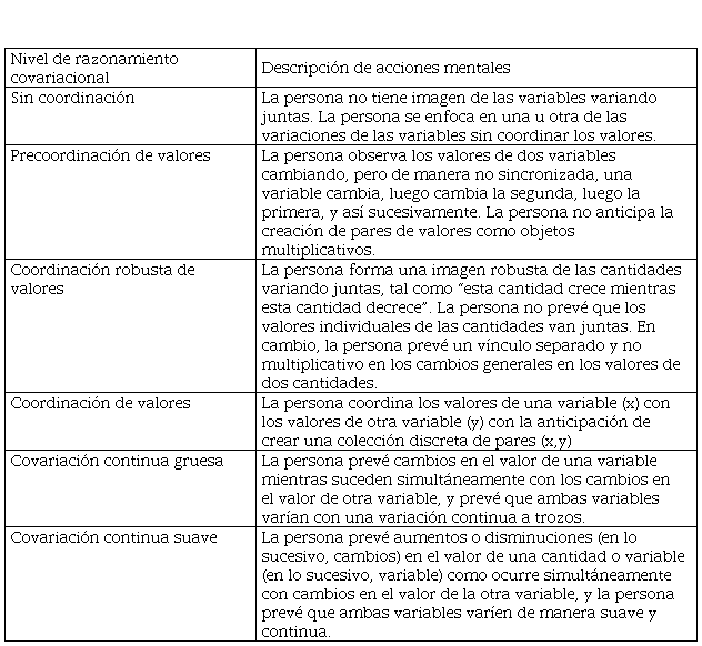 Desde una perspectiva más actual, el razonamiento covariacional se define formalmente como “las actividades cognitivas involucradas en coordinar dos cantidades variables mientras se atiende a las maneras en que estas cambian una en relación con la otra” (Carlson et al., 2002, p. 354). La manera en que el razonamiento covariacional se manifiesta es mediante niveles de desarrollo, los cuales aparecen en orden de sucesión. Una manera de determinar el nivel de razonamiento en que se encuentra un sujeto es mediante la identificación de las acciones mentales que el mismo efectúa al resolver problemas de covariación. Estas acciones mentales y los niveles de clasificación a los que corresponden están descritos en la tabla 1, propuesta por Carlson et al. (2002) y adaptada por Yemen-Karpuzcu, Ulusoy e Isiksal-Bostan (2015).