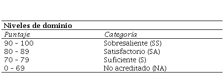 Para la UADY, para fines de promoción de un estudiante se define el nivel de dominio como los atributos o características que describen el grado en que el estudiante ha desarrollado determinada(s) competencia(s) de una asignatura, se representa de manera cuantitativa y cualitativa y debe registrarse en un documento validado por la institución. La representación cuantitativa del nivel de dominio se establece con un puntaje del 0 al 100 y este se categoriza en Sobresaliente, Satisfactorio, Suficiente y No acreditado (Tabla 1) (UADY, 2012).