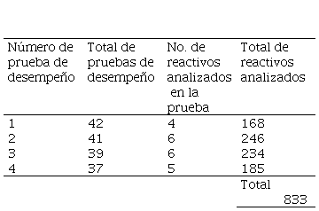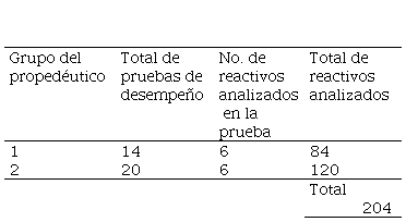 El conjunto de todas las pruebas de desempeño obtenidas fue de 193 y se decidió analizar la totalidad de ellas, de las cuales 34 fueron derivadas de los dos cursos propedéuticos y 159 generadas durante la impartición de los cursos de Algoritmia; esta información traducida al número de reactivos analizados en las pruebas se puede apreciar en las tablas 2 y 3.