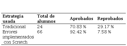 En cuanto al índice de aprobados y reprobados, en la Tabla 6 se encuentran los resultados obtenidos en estos cinco cursos, identificando los porcentajes de los alumnos con el método tradicional y con la implementación de los errores con apoyo de la herramienta de Scratch.