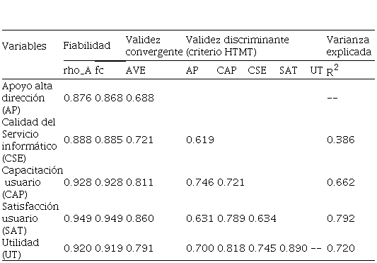 Una vez verificada la fiabilidad del ítem se procede con la del constructo, ello mediante la aplicación de dos medidas de consistencia interna: el coeficiente de fiabilidad compuesta (fc) y la rho_A. Para ambos se recurre a las directrices de Hair et al. (2016), quienes indican que deben ser mayores a 0.7. En la Tabla 3 se muestra lo alcanzado y, como se puede observar, las variables propuestas cuentan con una consistencia interna adecuada.