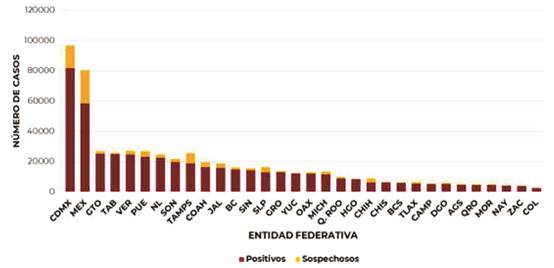 La Figura 1 muestra el total de casos confirmados por entidad federativa hasta el día en cuestión. Cada barra contiene doble información (casos confirmados y sospechosos) que se puede identificar por su color; además las barras están ordenadas de mayor a menor frecuencia, con lo que se puede identificar fácilmente el lugar que ocupa cada entidad federativa, con ello es posible establecer relaciones de comparación y de orden entre ellos, en un momento dado (información transversal).