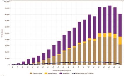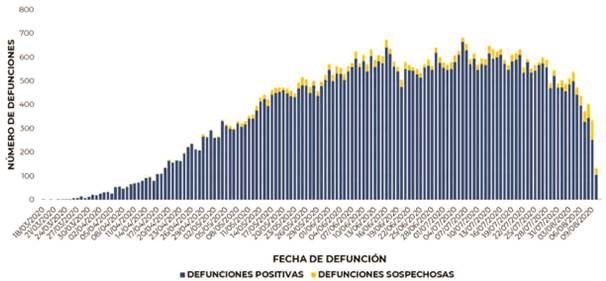 La Figura 2 muestra otro de los indicadores importantes, consiste en un diagrama de barras que muestra información sobre el comportamiento del número de defunciones confirmadas y sospechosas a través del tiempo, es por lo tanto una información de carácter longitudinal que nos permite ver los cambios en la variable de interés a través del tiempo.