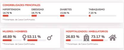 Los porcentajes son también una representación estadística muy utilizada en la información que proporciona la Secretaría de Salud sobre COVID-19. Un ejemplo de ello es cuando clasifican los casos confirmados positivos según su condición de enfermedades previas (comorbilidades), el impacto de la COVID-19 entre mujeres y hombres, y la condición de hospitalización de los pacientes. Figura 4.