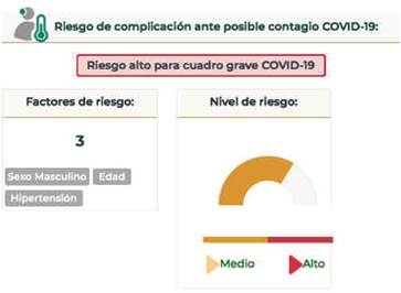 El azar también está presente en la información que se proporciona sobre COVID-19, generalmente por medio de expresiones probabilísticas de evaluación de riesgo. Un caso notable es la calculadora que el Instituto Mexicano del Seguro Social ha diseñado para determinar el nivel de riesgo de complicación ante un posible contagio de una persona, según sus condiciones de edad, género, peso y padecimientos. Figura 5.