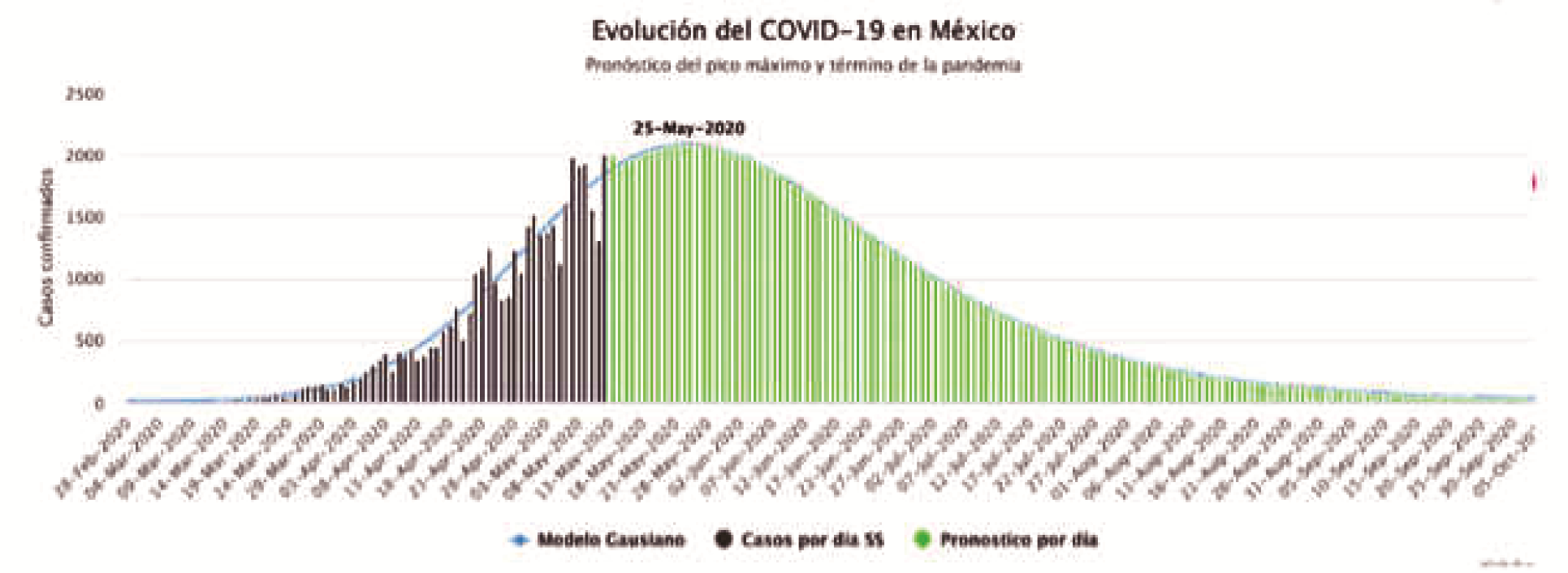 Puede verse que la gráfica es acampanada y con un ligero sesgo a la derecha. La curva suavizada representa los resultados del modelo, y las barras representan los datos que se van obteniendo a través del tiempo (número de casos confirmados con COVID-19). Obsérvese la gran similitud entre datos y modelo. De acuerdo con la gráfica el pico de la ola ocurrirá por el 25 de mayo, concluyendo a principios de octubre del 2020.