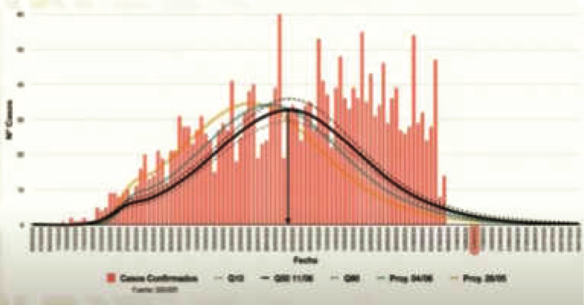 En el contexto de la pandemia de COVID-19, se han expuesto en los medios diversos modelos que predicen el punto máximo y la fecha probable de terminación de la enfermedad. El número de personas que se enferman de COVID-19 sigue una distribución acampanada, el patrón general es que empieza con pocos casos, estos se incrementan con el tiempo, llegan a un pico y luego empiezan a descender (ver Figura 8). Los datos obtenidos diariamente de los casos confirmados de COVID-19 se representan por las barras, los resultados del modelo se representan por la línea suavizada de color negro.