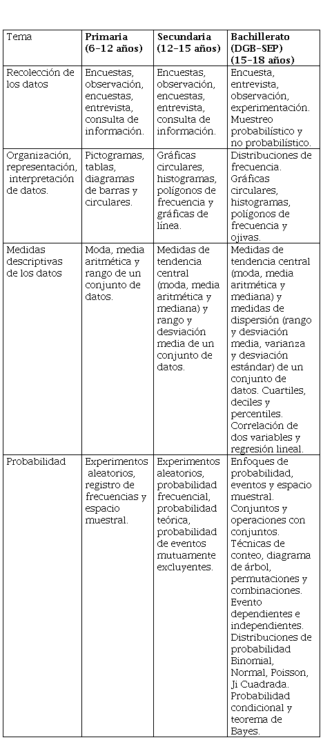 La recolección de datos, organización, representación de datos y medidas descriptivas –temas que se utilizan mucho para la presentación de información de COVID-19– constituyen la comuna vertebral del contenido estadístico, a lo largo de toda la educación básica y bachillerato en México. El estudio del azar, sus propiedades y métodos de cálculo, ocupa también una parte importante, sobre todo en secundaria y bachillerato, donde se estudian los fenómenos aleatorios a través de los enfoques clásico y frecuencial de la probabilidad, finalizando con las distribuciones de probabilidad, como modelos para variables aleatorias.