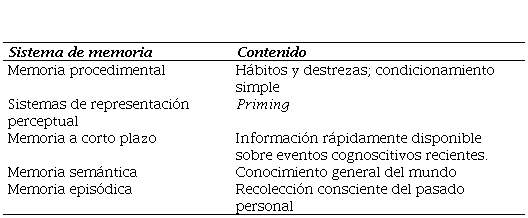 Además, como puede apreciarse en la Tabla 1, Tulving propone una serie de sistemas mentales de memoria que interactúan continuamente en diferentes niveles de conciencia que describe de la siguiente forma: “1 La adquisición, que como su nombre lo indica, es la forma en que ingresa la información según el tipo de memoria; 2. La representación de la información en el sistema de memoria; es decir, la forma en que se codifica o clasifica la información y 3. La expresión de conocimiento; es decir, la forma en la que la información se exterioriza por el individuo” (Carboni, 2007, p. 248).