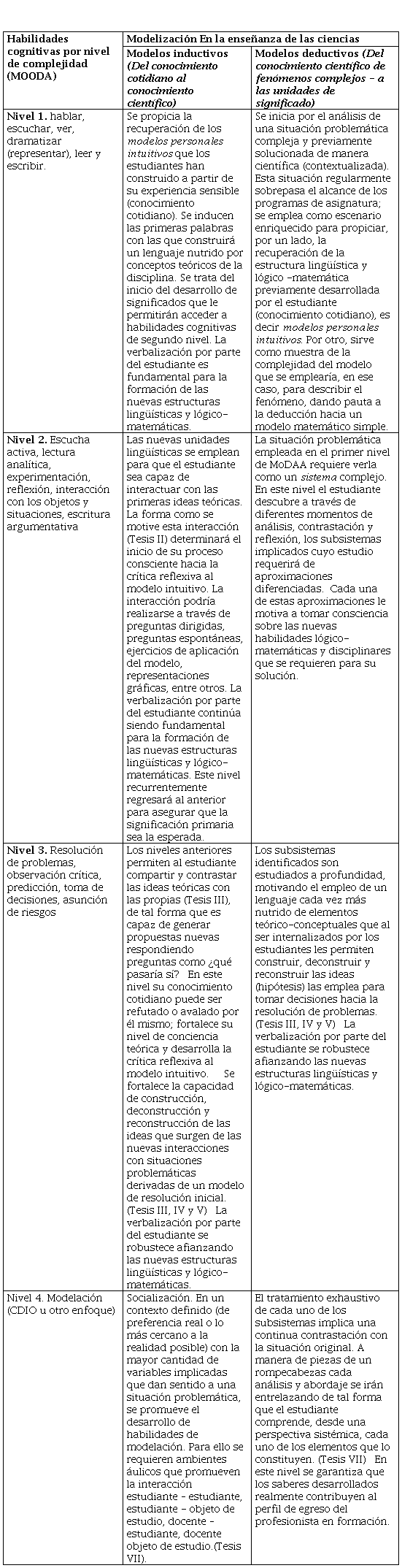 Como puede apreciarse, el aprendizaje activo enfocado a la modelización implica necesariamente considerar la estructura lingüística como base fundamental para el aprendizaje de las ciencias básicas, es decir que la falta de significados conceptuales impide a los estudiantes desarrollar relaciones, proponer ideas y plantear hipótesis para resolver cualquier tipo de problema. Obsérvese en la Tabla 1 la evidencia de que en la práctica docente cotidiana en las clases de ciencias se omite la estimulación de los dos primeros niveles propuestos en el MoDAA, enfocándose tradicionalmente en el nivel 3, en el cual el estudiante ya debería haber construido el entramaje teórico-conceptual que le permitiera proponer hipótesis y soluciones a problemas dados.