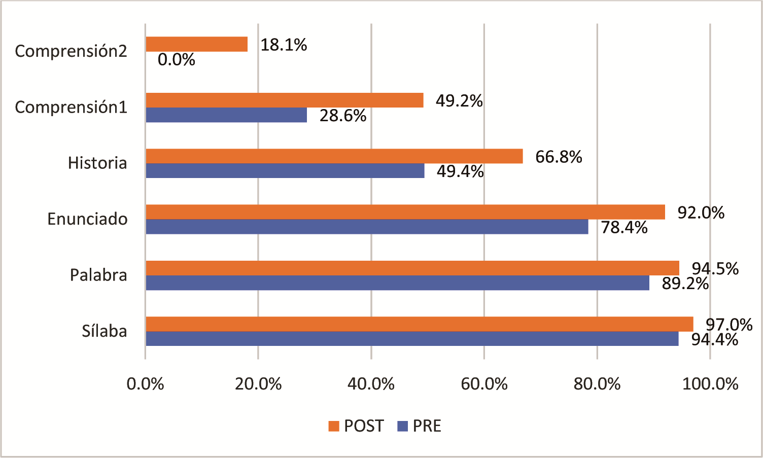 La Figura 1 resume las mediciones pre-post en lectura, mostrando mejores resultados en la medición post que en la medición pre.