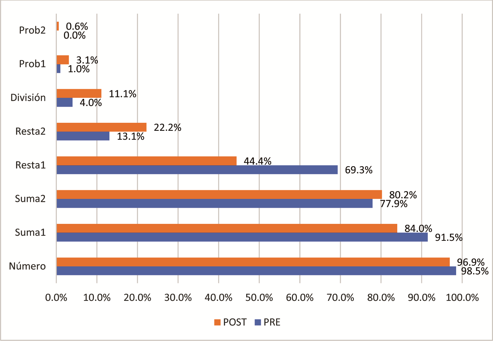 La Figura 2 muestra los porcentajes en las mediciones pre-post, indicando que, a pesar de los avances luego de esta intervención, permanecen resultados bajos en matemáticas. Incluso después de estas intervenciones, solo 44% de la muestra pudo responder restas con acarreo satisfactoriamente, y solo 11% pudo responder un problema simple.