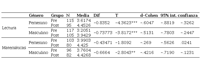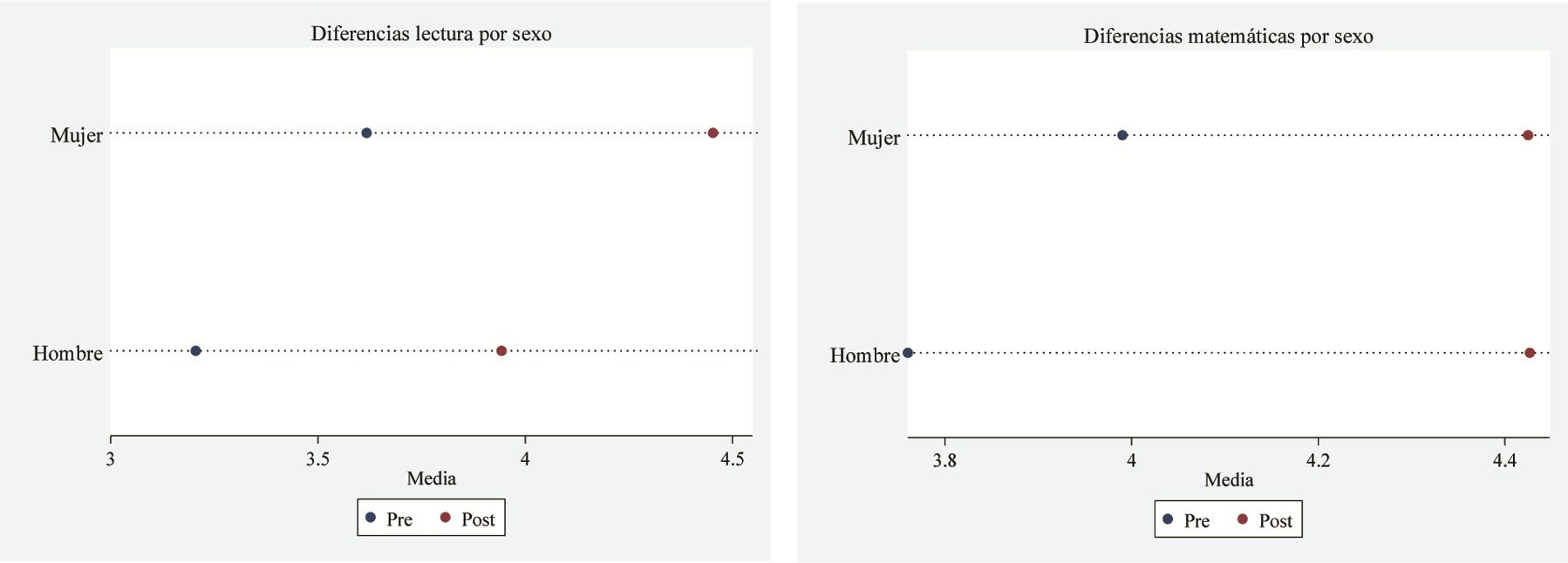 La Figura 3 permite observar cómo en lectura avanzaron tanto hombres como mujeres. En matemáticas ambos grupos llegan a medias similares en la medición post, avanzando más los hombres, que iniciaron con medias menores en la medición pre, acortando así la brecha de género en esta muestra.