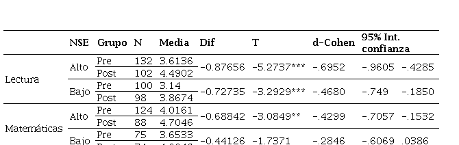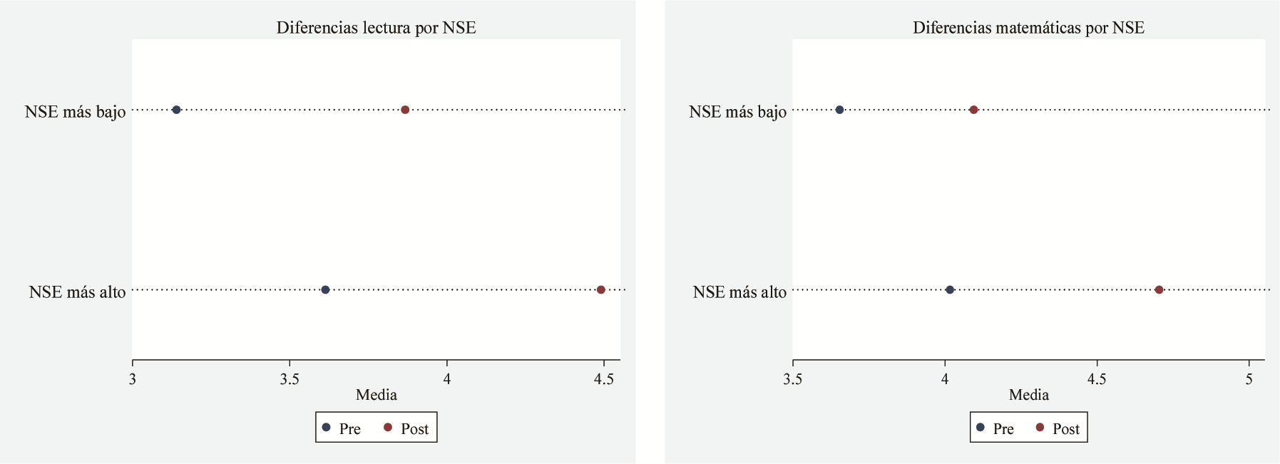 El nivel socioeconómico es uno de los determinantes más importantes del logro educativo (Banerjee, 2016), que afecta desproporcionadamente más a la región de América Latina y el Caribe por sus crónicas desigualdades de ingreso (UNESCO, 2020a). En México existe una importante literatura que mide los efectos de la desigualdad económica en los resultados educativos (Blanco, 2013; Cervini, 2003; Solana, 2005). Para el caso de los cursos remediales analizados considerando el nivel socioeconómico, la Tabla 8 compara las medias en lectura y matemáticas de los sujetos con mayor y con menor NSE. Se pueden observar mejoras en lectura y matemáticas en ambos grupos, generando efectos más amplios en el grupo con alto NSE.