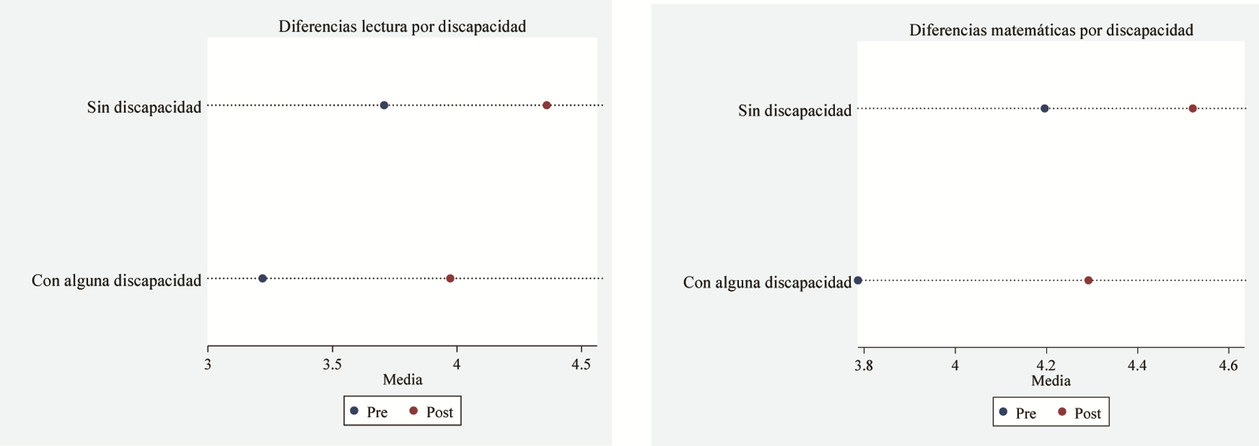 Por último, en el tema de discapacidad, después de las intervenciones, los niños y niñas lograron mejores avances cuando presentaban al menos un dato de discapacidad, tanto en lectura como en matemáticas. Al respecto se encontró relativamente poca información, punto ya reseñado por diversas iniciativas para mejorar la calidad de datos respecto a la equidad educativa y discapacidad (Measurement and Metrics Working Group y Save the Children, 2016; Omoeva et al., 2016).