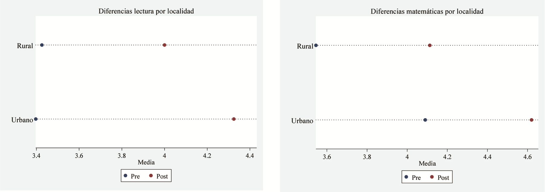 La Figura 6 muestra cómo hubo mayores ganancias en sujetos urbanos en lectura. En matemáticas, los sujetos rurales terminaron con una media equivalente a como iniciaron los sujetos urbanos, quienes avanzaron más, manteniéndose las brechas previas.