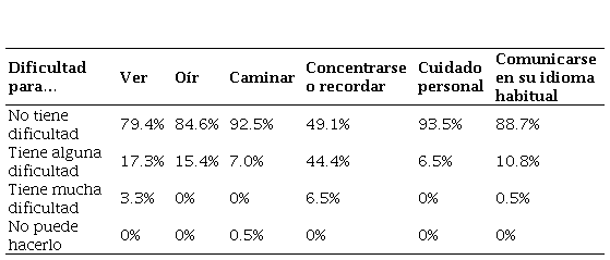 Para discapacidad, se utilizó el “Cuestionario breve” elaborado por el Grupo de Washington sobre discapacidad (CEPAL, 2020), que mide la intensidad de las condiciones de discapacidad en cinco dimensiones: discapacidad visual, auditiva, motora, cognitiva, y dificultades de autocuidado y para comunicarse.