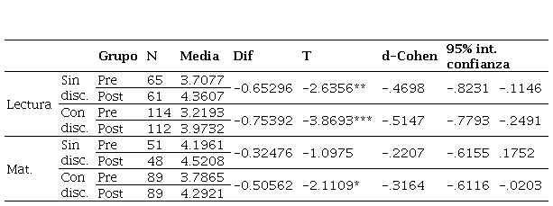 La Tabla 10 muestra las comparaciones entre sujetos sin discapacidad y con al menos una discapacidad. Aquí también se puede ver que, con excepción de matemáticas sin discapacidad, todos los grupos mejoran significativamente sus medias luego de la intervención. Se aprecian diferencias más marcadas entre los sujetos con alguna discapacidad en matemáticas y lectura.