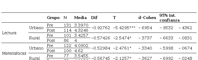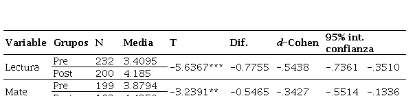 Al comparar medias de las mediciones vemos aumentos moderados pero significativos y positivos en los aprendizajes tanto en lectura como en matemáticas. Utilizando la prueba d de Cohen, se estiman efectos moderados en ambos dominios (Cohen, 2013). Tabla 6.