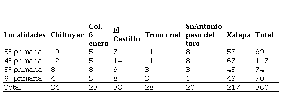 Se elaboró un muestreo no probabilístico intencional, por solicitud de los participantes en recibir el curso entre octubre y diciembre del 2020, mientras que las escuelas se encontraban cerradas por la pandemia de Covid-19. Participó un total de 360 sujetos inscritos en escuelas públicas, entre 3º y 6º de primaria de seis localidades (cinco rurales y una urbana), entre 7 y 13 años, con un promedio de edad de 9.49 años (DE = 1.238), habitantes del municipio de Xalapa, Ver. (Tabla 1). 49.44% fueron mujeres y 50.56% hombres.