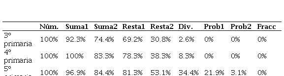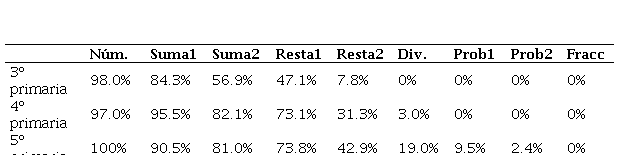 En matemáticas también se encontró una situación de rezago importante. En 5º de primaria, solo 42.9% de estudiantes pudo responder restas con acarreo, y solo 19% pudo responder divisiones. En 6º de primaria solo 2.6% pudo responder problemas y no hubo nadie que llegara a resolver satisfactoriamente problemas con fracciones (Tabla 3).
