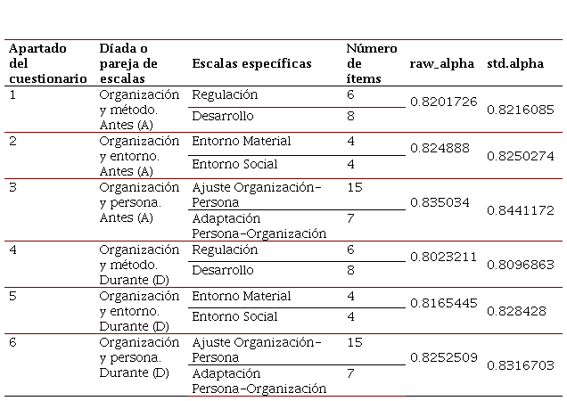 El instrumento está integrado por 44 ítems organizados en seis escalas específicas que, a su vez, pertenecen a tres escalas agrupadas en pares, a saber: regulación y desarrollo, que integran la escala Organización y método; entorno material y entorno social, parte de Organización y entorno, y ajuste organización-persona y adaptación persona-organización, de la escala Organización y persona (Blanch et al., 2010). Se utilizó el mismo cuestionario para valorar las condiciones de trabajo (A) antes del confinamiento y (D) durante el confinamiento, la única diferencia con el instrumento original fue que al inicio de cada enunciado se colocaba la leyenda “antes del confinamiento” para el primer cuestionario (A) y “durante el confinamiento” para el segundo cuestionario (D).