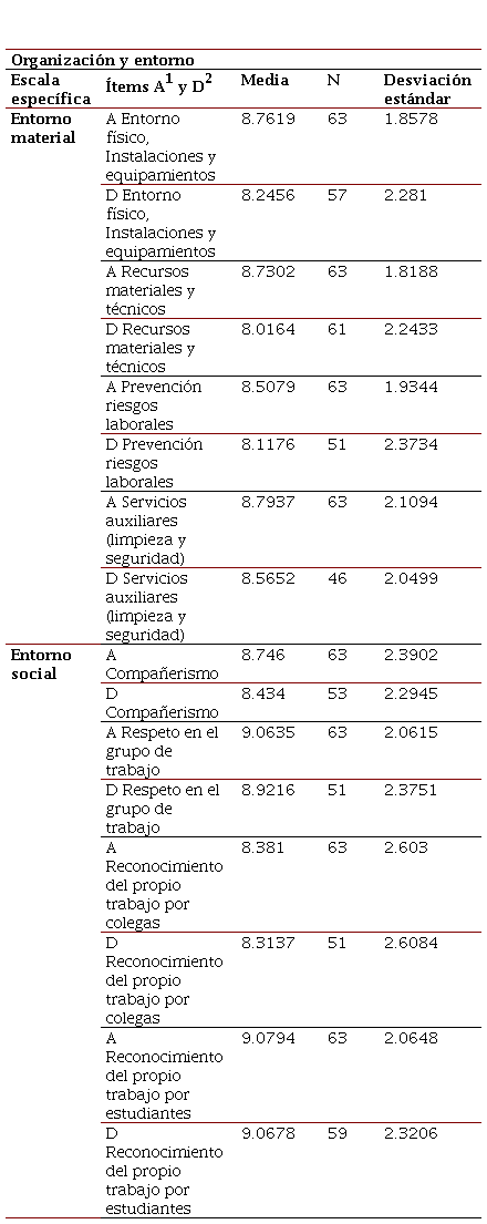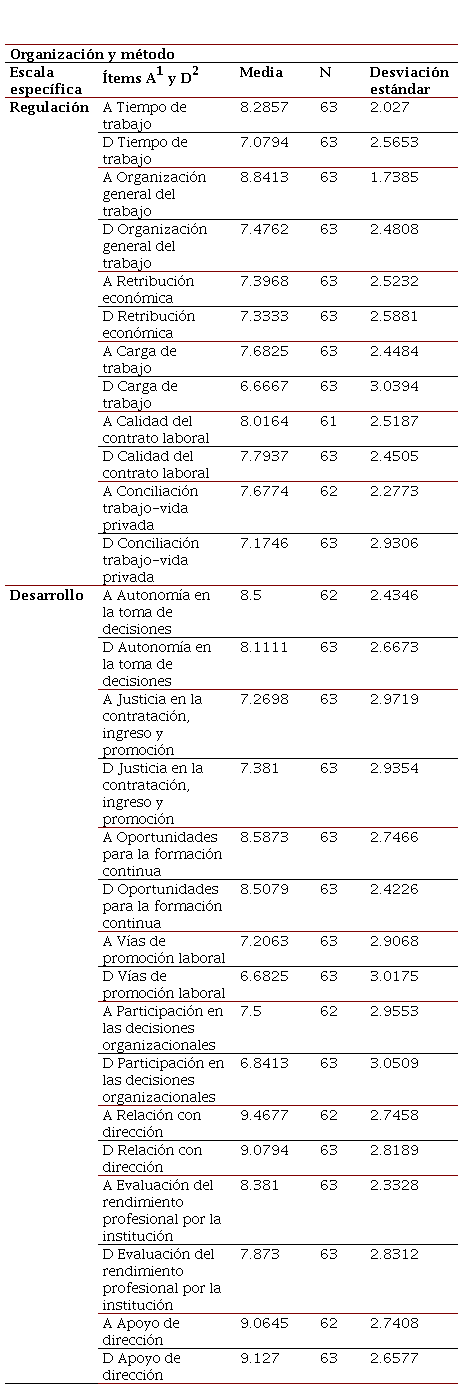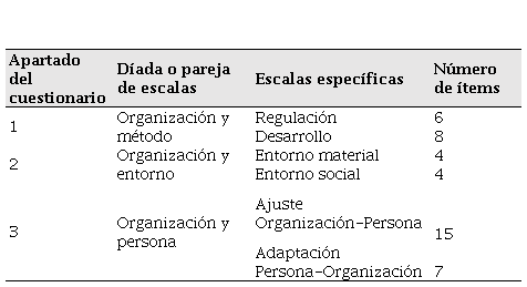 En los bloques de Organización y método (regulación y desarrollo) y de Organización y entorno (escalas de entorno material y de entorno social), la puntuación en cada variable puede abarcar el continuo bipolar entre “0” (valor “pésimo”) y “10” (valor “óptimo”). En el bloque Organización y persona (escalas ajuste o-p y adaptación p-o) las puntuaciones pueden extenderse desde el “1” (“total desacuerdo”) al “7” (“total acuerdo”) (Blanch et al., 2010).