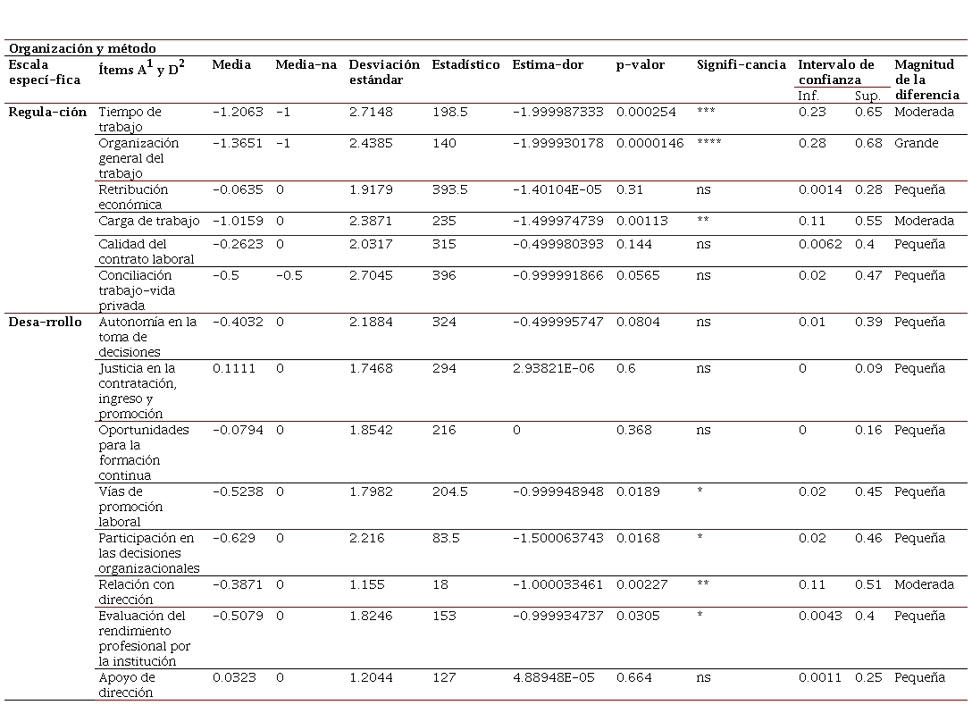 La díada Organización y método fue la más afectada por el confinamiento, 4 ítems de 14 fueron afectados significativamente. Entre ellos el tiempo de trabajo, la carga de trabajo y la relación con la dirección con una diferencia moderada y la organización del trabajo con una diferencia grande. La organización del trabajo fue el elemento más afectado por la pandemia de todos los ítems que integran las condiciones de trabajo (Tabla 2). Todos estos elementos eran mejor percibidos antes del confinamiento.