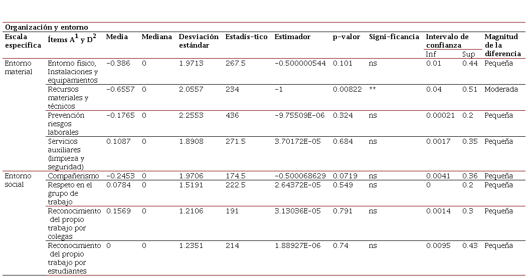 De los ocho ítems que integraron la escala específica Organización y entorno solamente uno, los recursos materiales y técnicos, resultó afectado significativamente, la magnitud de la diferencia fue moderada (Tabla 4). Es evidente que la disposición de los recursos necesarios para desempeñar el trabajo desde casa, como las computadoras, laptops, cámaras web, etc., o contar con un buen servicio de Internet fueron los elementos que más fueron afectados negativamente durante este periodo de la pandemia, pues los docentes no estaban preparados para trabajar en sus hogares de tiempo completo.