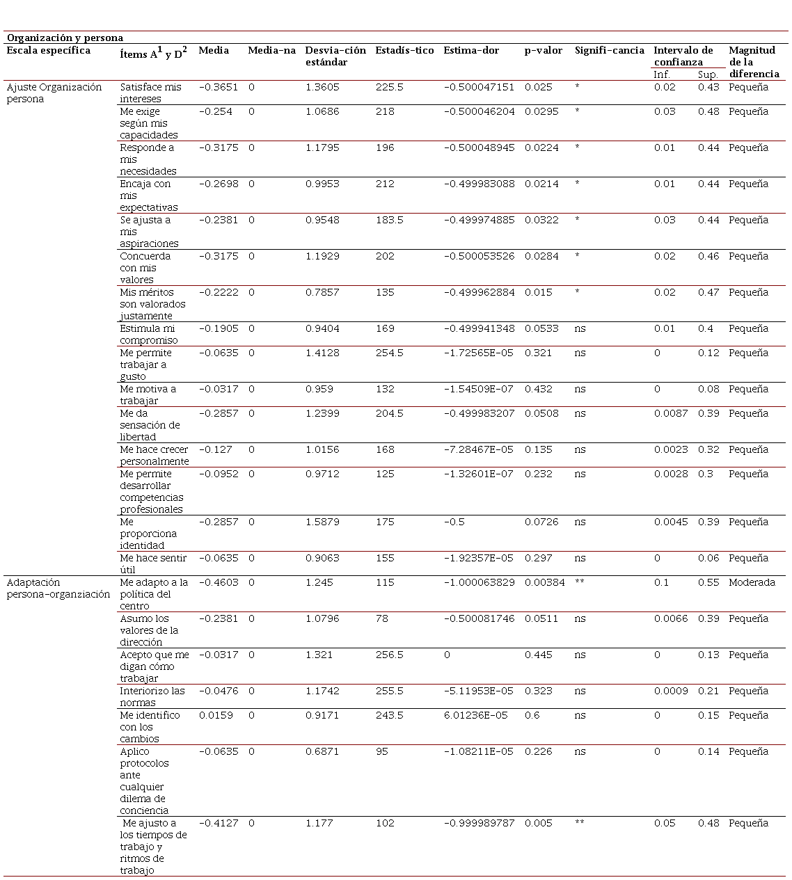 En la última díada, Organización y persona, solamente uno de los 22 ítems tuvo una diferencia significativa con magnitud moderada, los 21 restantes tuvieron una diferencia pequeña (Tabla 6). El ítem Me adapto a la política del centro fue el único afectado negativamente a causa de la pandemia.