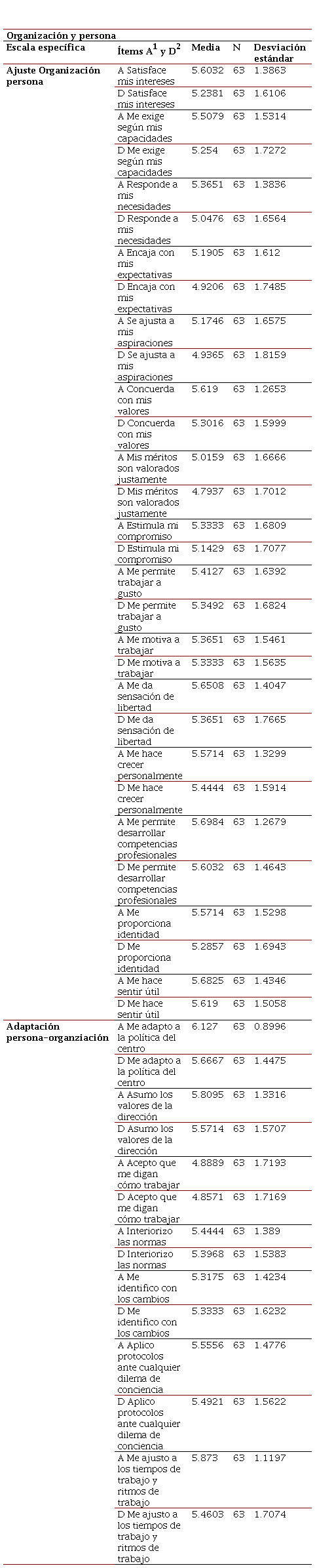 En esta díada los ítems de la escala específica Ajuste organización-persona comenzaban con el enunciado “La organización del trabajo de mi centro” y los de la escala específica Ajuste organización-persona comenzaban con el enunciado “Ante las demandas de mi organización”. En ambos casos los valores iban del “1” (“total desacuerdo”) al “7” (“total acuerdo”).
