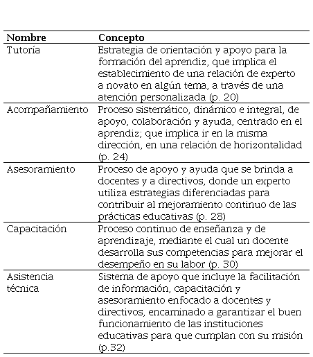 Al hablar de la asesoría académica o técnico-pedagógica se hace necesario identificar la diferencia entre asesoramiento, capacitación, asistencia técnica, acompañamiento y tutoría, conceptos relacionados entre sí que entre su función marcan una diferencia, como se observa en la Tabla 1.