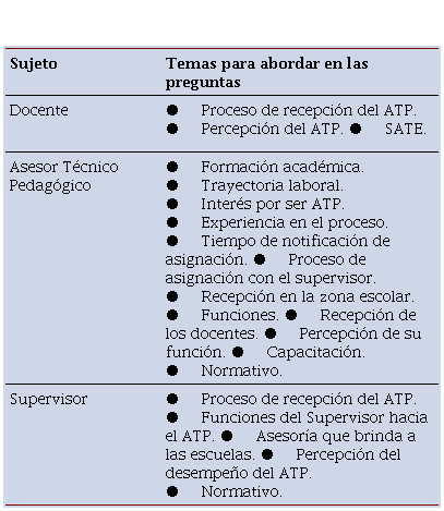 Para la selección de la muestra se solicitó a las distintas direcciones y subdirecciones información sobre aquellas supervisiones que cumplían con lo anterior, por lo que se estableció un primer acercamiento, así se entrevistó a los 18 sujetos educativos descritos; para facilitar la sistematización y análisis de la información, las entrevistas fueron grabadas con la autorización de los participantes (se firmó de forma autógrafa un consentimiento informado del compromiso de salvaguardar la información personal y evitar cualquier publicación que los identifique, razón por la cual se utiliza S01 al S06 para identificar a los supervisores, A1 al A6 para los ATP y D1 al D6 para los docentes), posteriormente se transcribieron y, a través de las categorías establecidas a priori acorde con la tabla 2, se analizaron las percepciones de los informantes estableciendo para ello códigos inductivos y deductivos de información y se realizó la triangulación de fuentes de datos con respecto a la teoría encontrada y la triangulación del investigador (Denzin, 1989, citado en Stake, 1999).