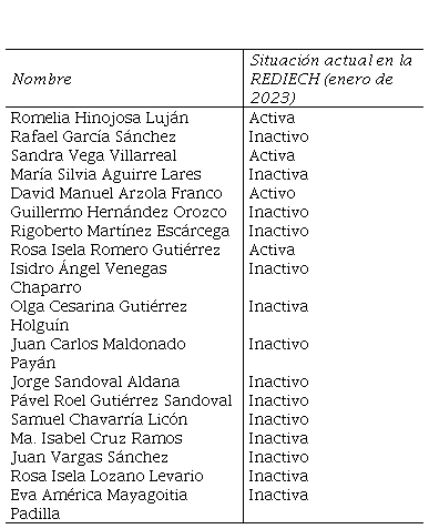 Con el paso de los años, los proyectos emprendidos desde la REDIECH se consolidaron y la participación de la membresía se volvió más compleja. De las 18 personas fundadoras que aparecen en el acta notarial (REDIECH, 2010) solamente permanecen 4, y las 14 restantes se alejaron por situaciones diversas, que van desde la jubilación en el servicio hasta el cambio en las expectativas personales (ver Tabla 1). Un número importante de miembros fundadores, sin aparecer en el acta notarial, continuamos participando de lleno en actividades sustanciales; otros nuevos integrantes se sumaron en el camino y lo dejaron, algunos más continúan y otros permanecen a la expectativa de integrarse cuando llegue el momento adecuado.